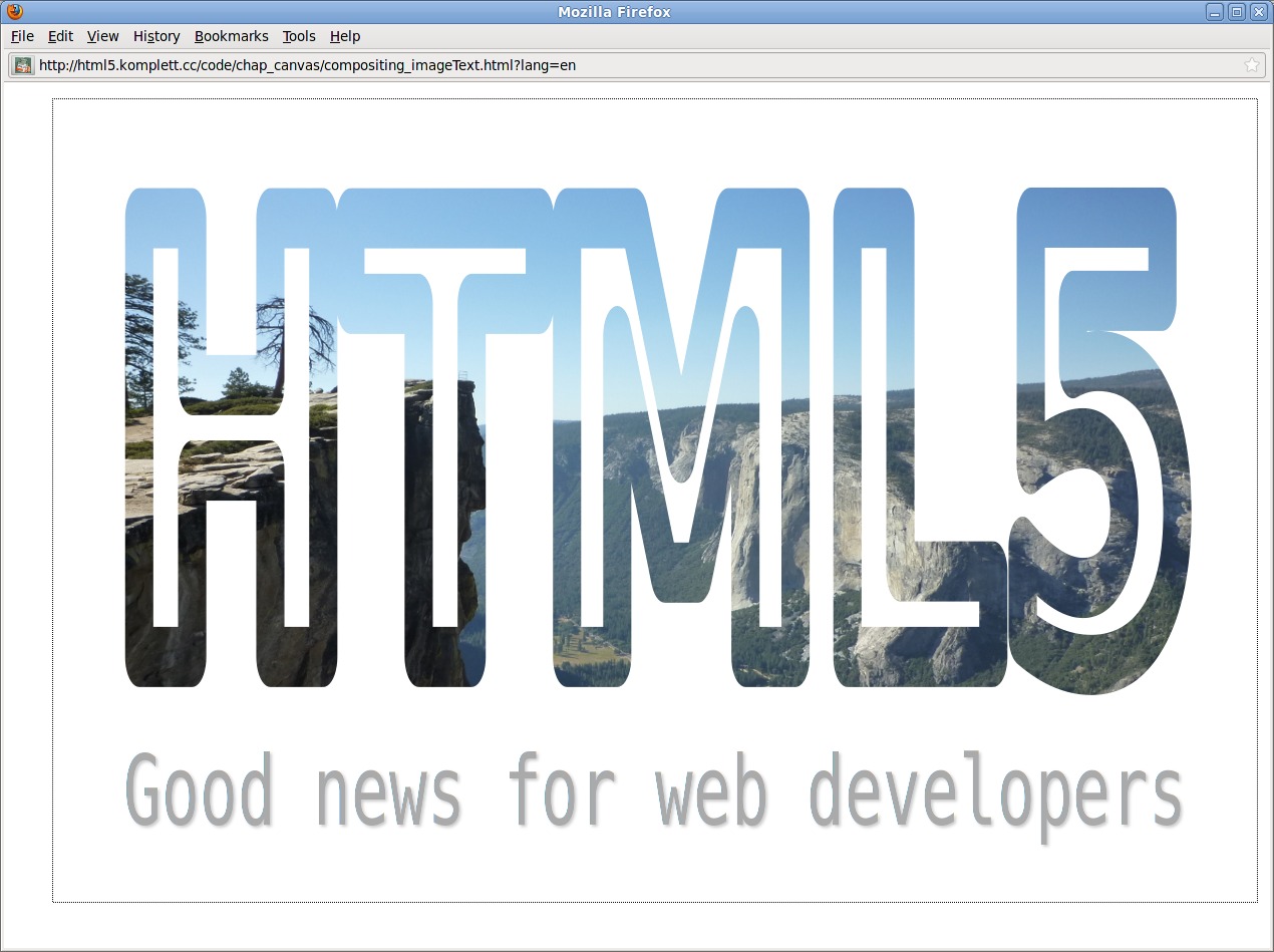 | 151 | Figure 5.31 Compositing operation “destination-in” with image and text created with: Firefox 3.6 tested with: Firefox 3.6, Opera 10.6 (rendering wrong), Chrome 6 (destination-in not implemented correctly, maxLength wrong for subtitle), Safari 5 (destination-in not implemented correctly, maxLength wrong for subtitle) | |