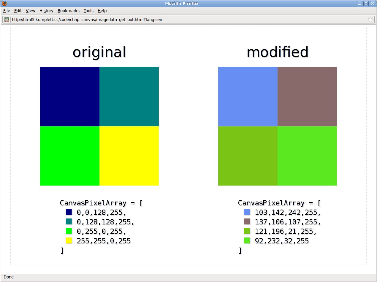 | 146 | Figure 5.29 Color manipulation with “getImageData()” and “putImageData()” created with: Firefox 3.6 tested with: Firefox 3.6, Opera 10.6 (method createImageData() not implemented), Chrome 6 (method createImageData() not implemented), Safari 5, IE 9b | |