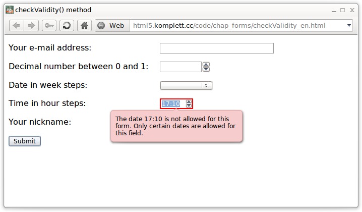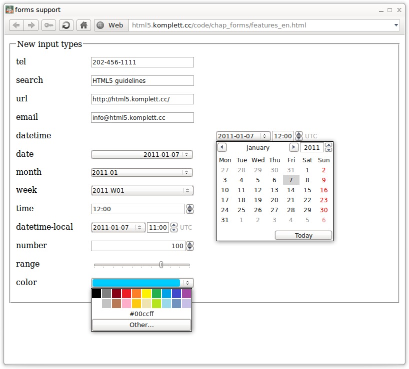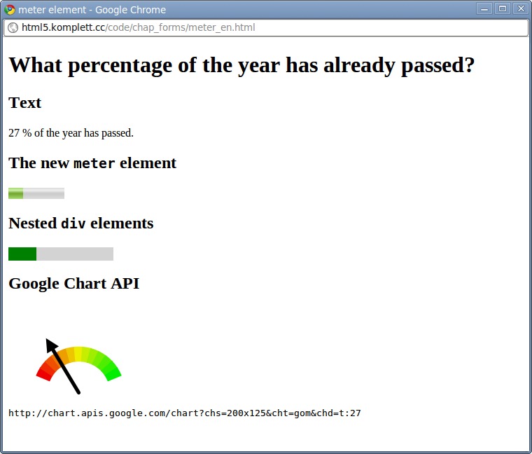 This page shows all examples, graphics and links used in this chapter of HTML5: Guidelines for Web Developers. The first table lists examples and graphics with the relevant page numbers in the book, includes links (where applicable) to the online version of that page plus information on browser compatibility, and shows a preview of the figure in the book. Click on this preview to load the figure in original size in JPEG format. The second table lists all URLs which appear in the book on the relevant pages. If you would like to leave feedback or report any errors and bugs, please use the e-mail contact above.