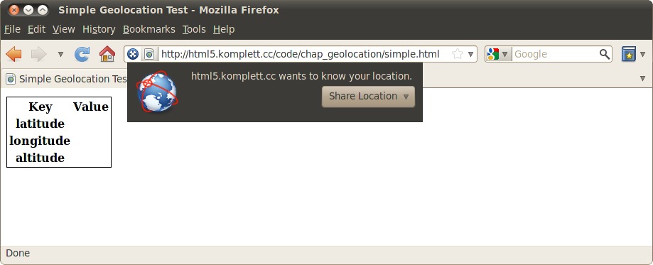 | 217 | Abbildung 7.2: Ausgabe der geografischen Position in Mozilla Firefox Erstellt mit Firefox 3.6 Läuft mit IE 9b | |