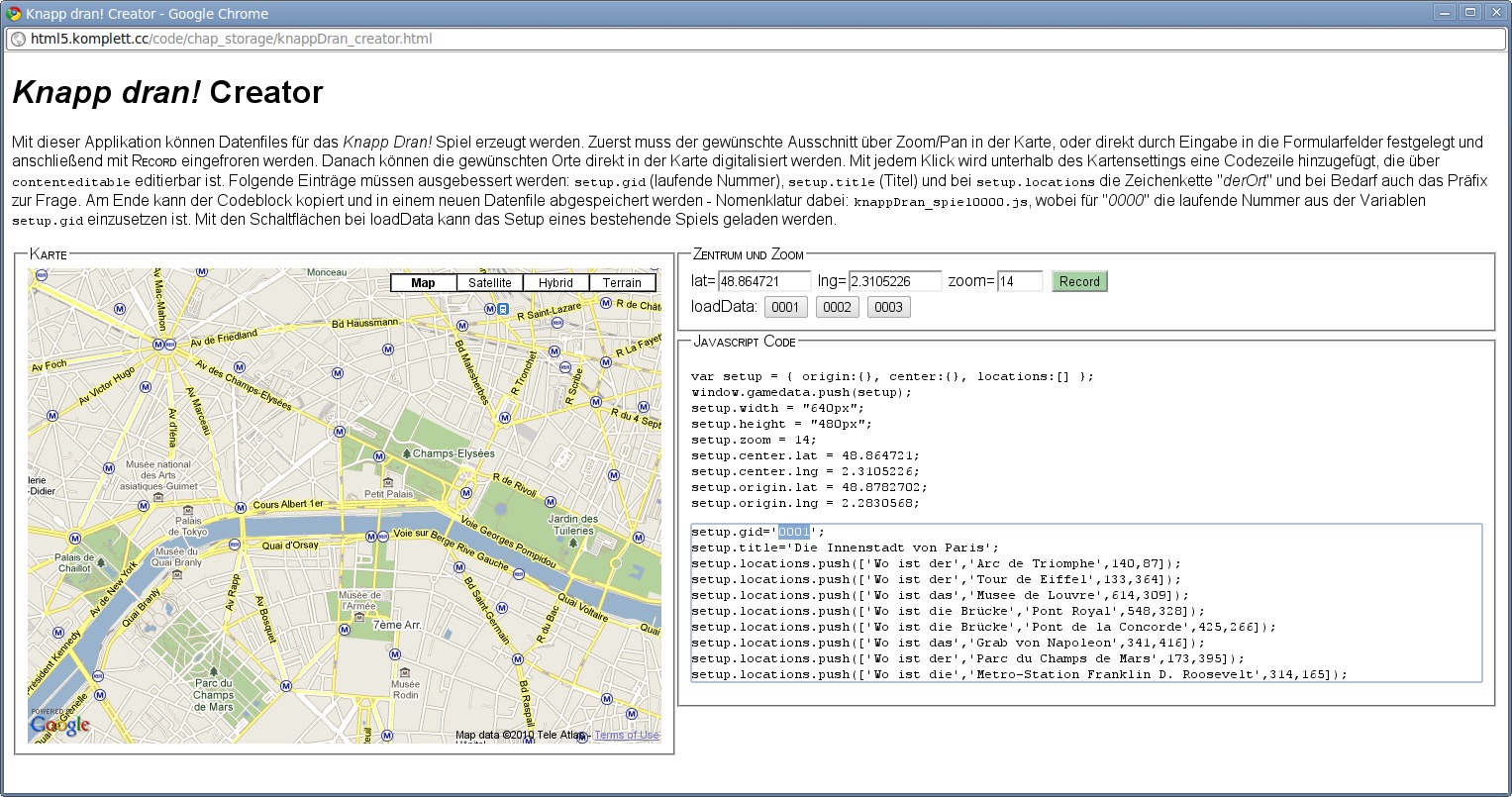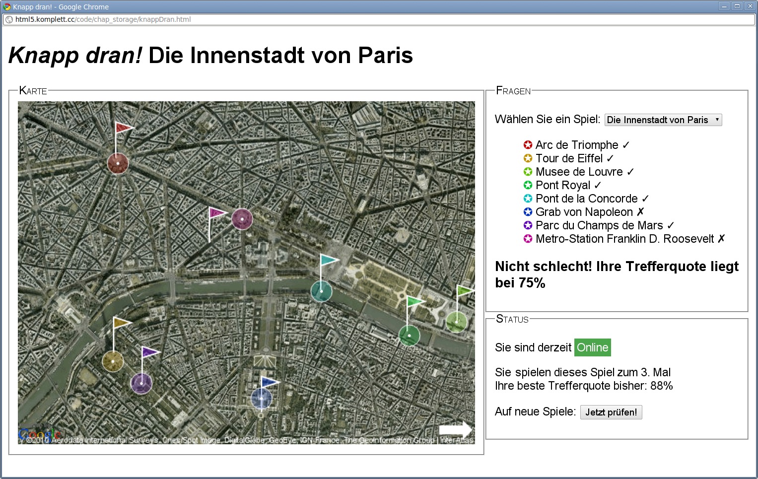 | 249 | Abbildung 8.6: Das Programm »Knapp dran!« während eines Spiels Erstellt mit Chrome 6 Läuft mit Firefox 3.6, Opera 10.5, Chrome 6, Safari 5 (Cache MANIFEST nicht richtig unterstützt) | |
