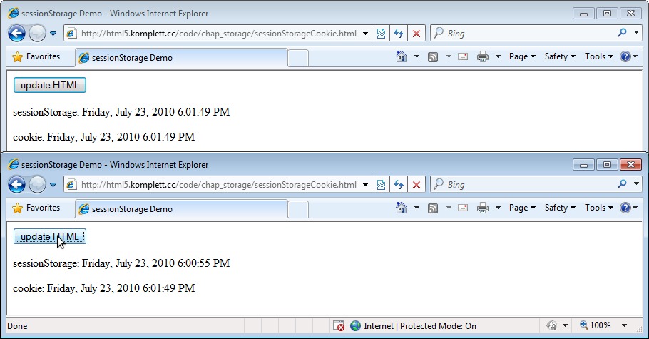 | 235 | Abbildung 8.1: Unterschiede zwischen »sessionStorage« und Cookies in zwei Fenstern Erstellt mit IE 9b | |