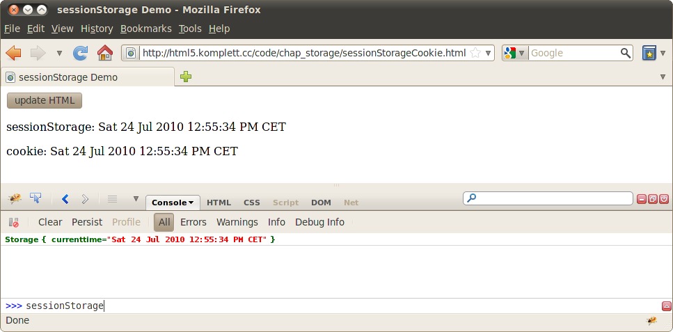 | 237 | Abbildung 8.2: Das Firefox-Add-On Firebug mit der Anzeige des »sessionStorage« Erstellt mit Firefox 4.0b | |