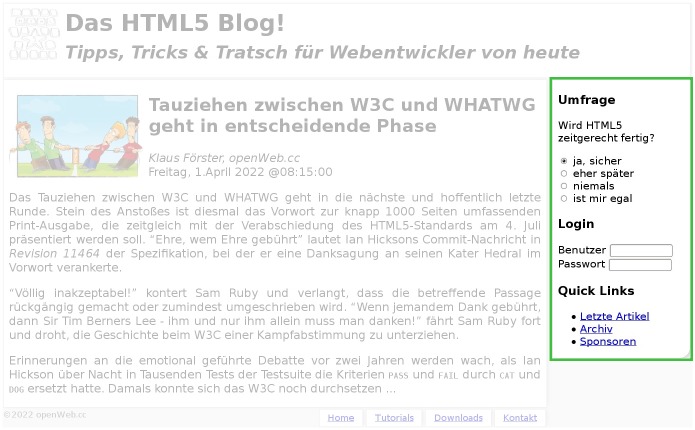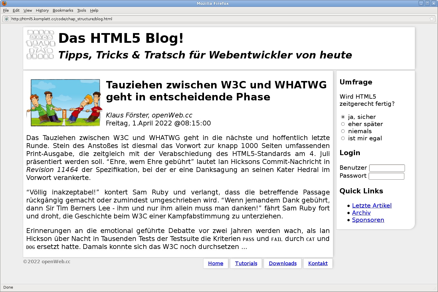 | 42 | Abbildung 2.5: Das Grundgerüst der HTML5-Blog-Randspale Erstellt mit Firefox 3.6 Läuft mit Firefox 3.6, Opera 10.6, Chrome 6, Safari 5, IE 9b | |