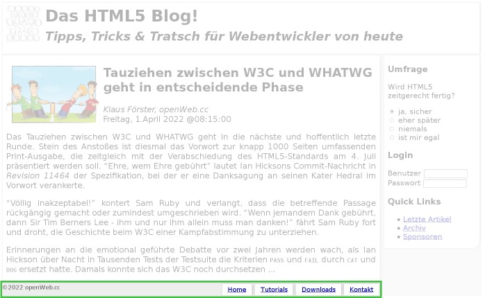 | 41 | Abbildung 2.4: Das Grundgerüst der HTML5-Blog-Fußzeile Erstellt mit Firefox 3.6 Läuft mit Firefox 3.6, Opera 10.6, Chrome 6, Safari 5, IE 9b | |