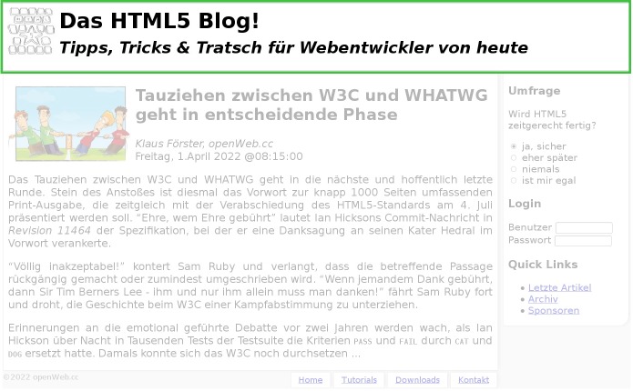 | 36 | Abbildung 2.1: Das fiktive HTML5-Blog Erstellt mit Firefox 3.6 Läuft mit Firefox 3.6, Opera 10.6, Chrome 6, Safari 5, IE 9b | |