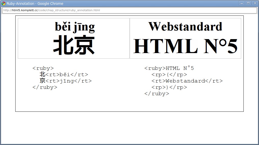 | 46 | Abbildung 2.7: Zwei Beispiele für die Ruby-Annotation Erstellt mit Chrome 6 Läuft mit Chrome 6, Safari 5, IE 9b |