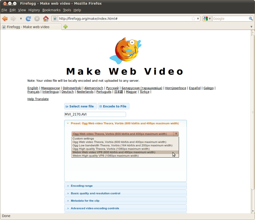 | 103 | Abbildung 4.4: Die Einstellungen zum Konvertieren von Videos in Firefogg Erstellt mit Firefox 3.6 | |