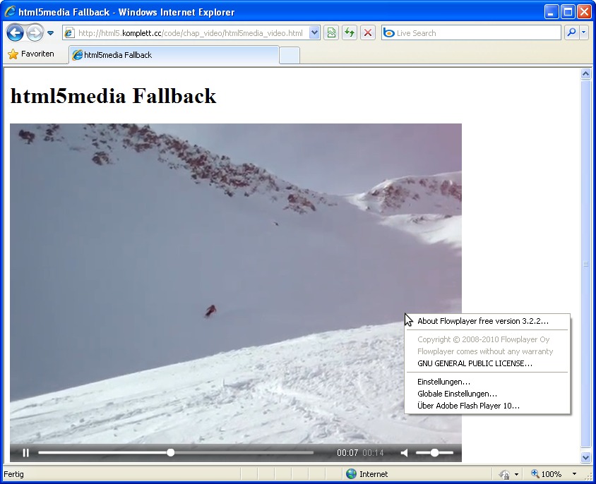 | 109 | Abbildung 4.8: Internet Explorer 8 mit dem freien Flowplayer (Flash-Fallback) Erstellt mit IE 8 | |