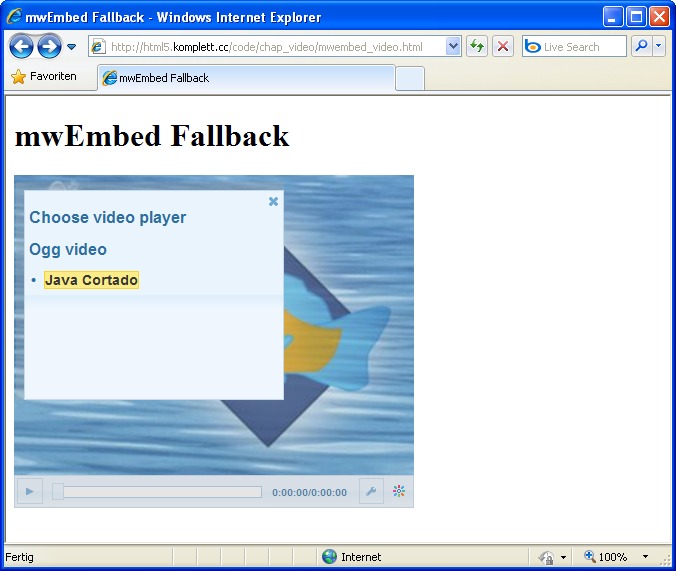 | 108 | Abbildung 4.7: Der Internet Explorer 8 mit der Fallback-Bibliothek »mwEmbed« von Kaltura Erstellt mit IE 8 | |