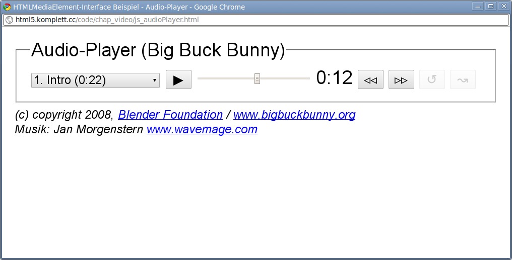 | 125 | Abbildung 4.10: Screenshot des JavaScript-HTML5-Audio-Players Erstellt mit Chrome 6 Läuft mit Firefox 3.6 (fastFwd funktioniert nicht, kein Slider), Opera 10.6 (fastFwd funktioniert nicht, Unregelmäßigkeiten beim Slider), Chrome 6 |