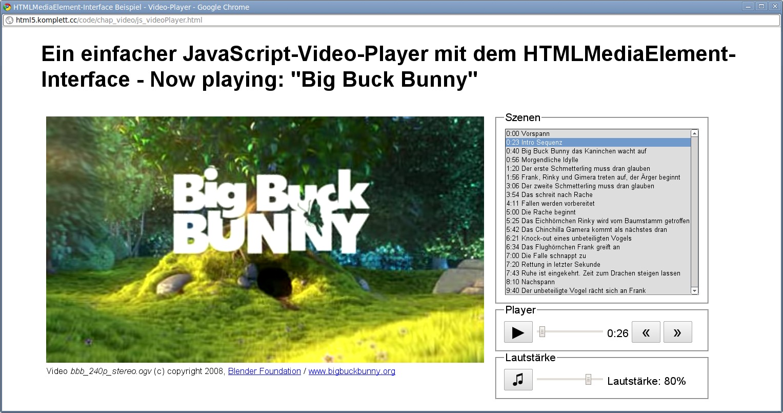 | 111 | Abbildung 4.9: Screenshot des JavaScript-HTML5-Video-Players Erstellt mit Chrome 6 Läuft mit Firefox 3.6 (fastFwd funktioniert nicht, kein Slider), Opera 10.6 (fastFwd funktioniert nicht), Chrome 6 | |