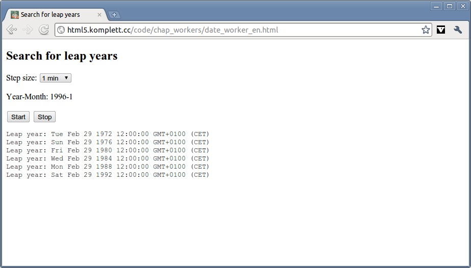 | 251 | Figure 10.1 Web worker searching for leap years created with: Chrome 6 | |